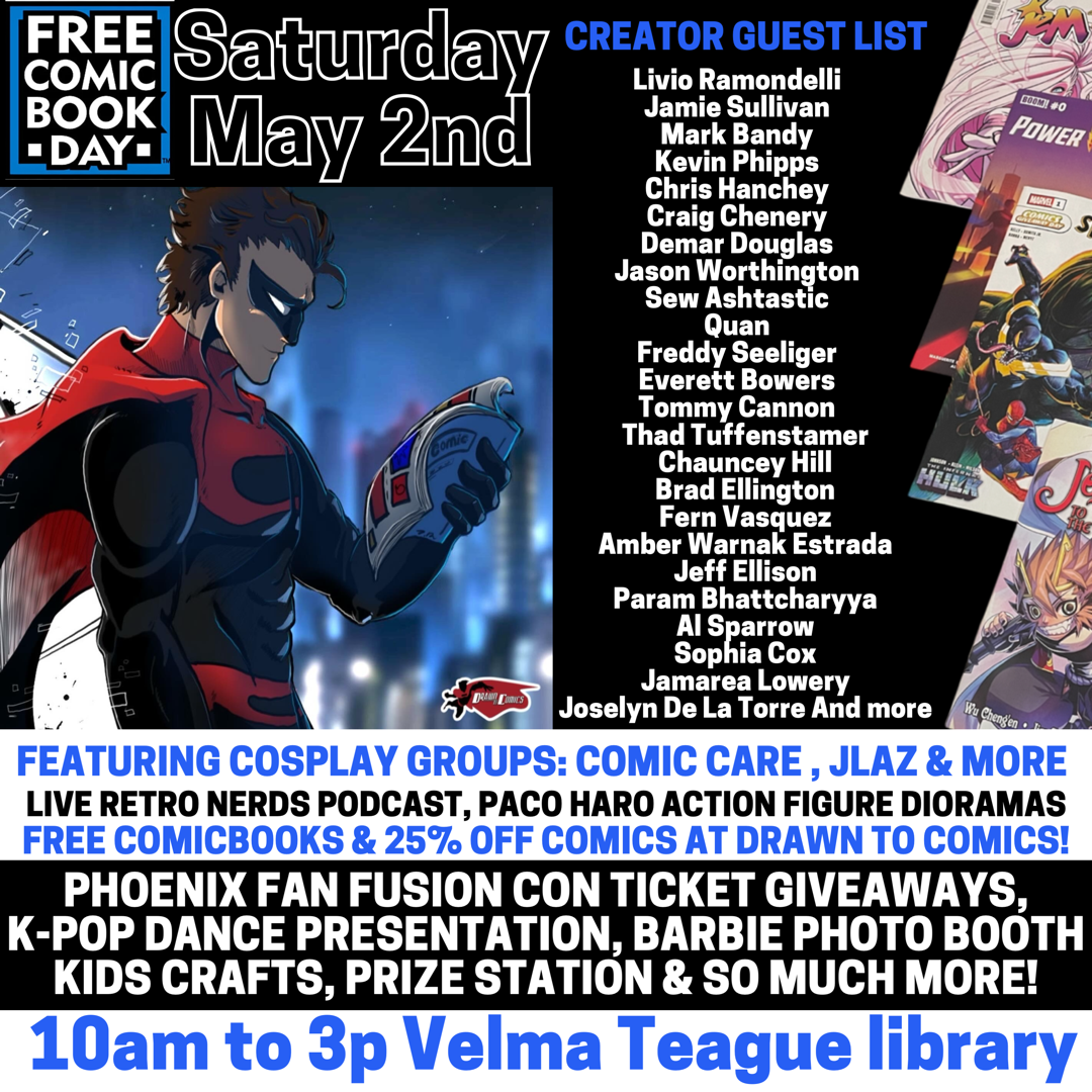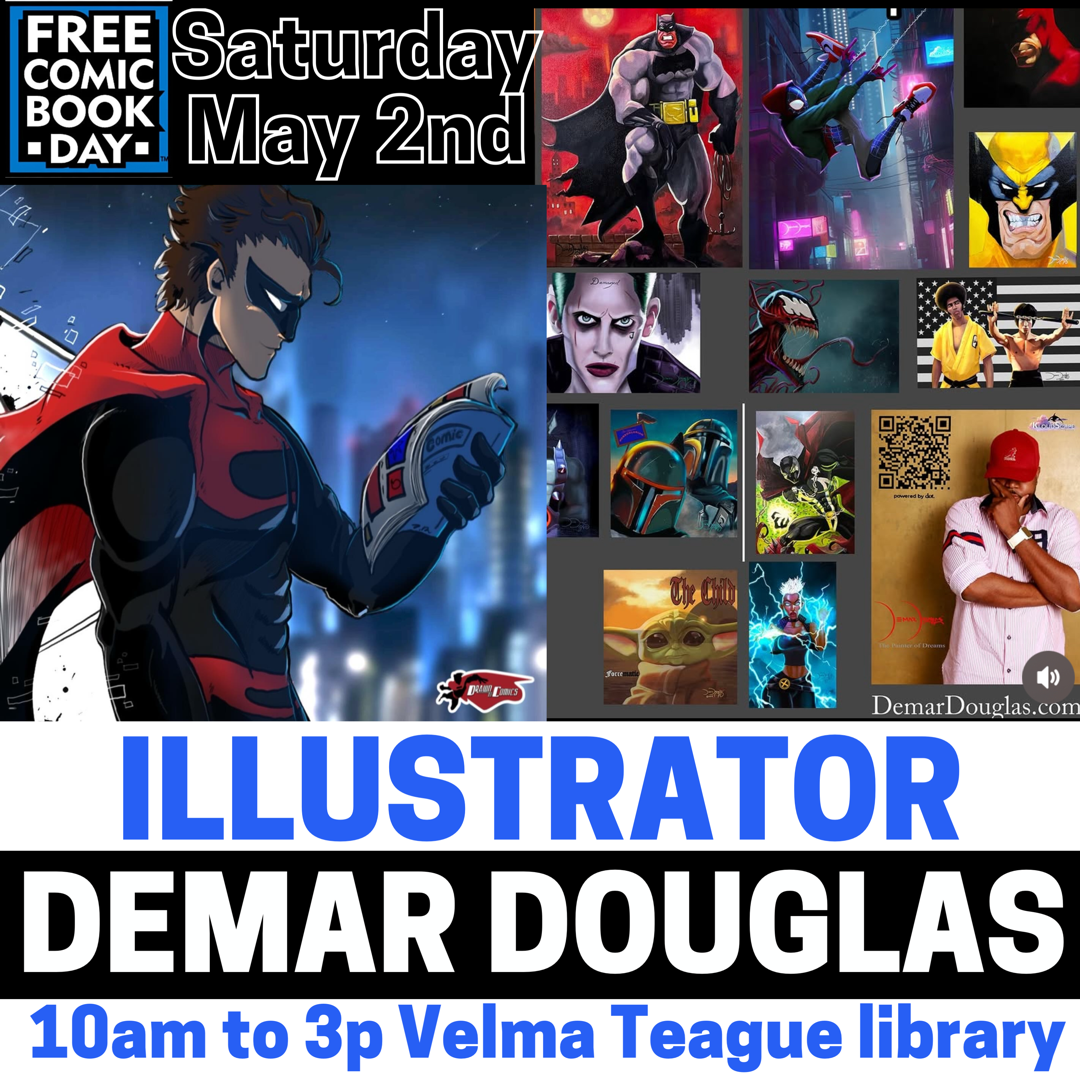 Visit DemarDouglas.com for the most up to date information of this amazing artist attending the Drawn To Comics Free Comic Book Day Festival May.