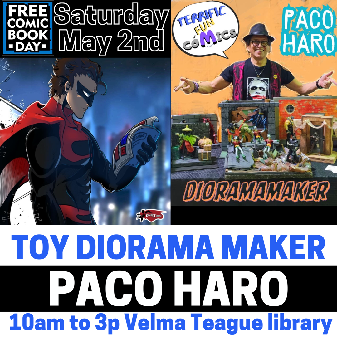 Terrific Fun Comics Podcast host and expert Action Figure Diorama crafter Paco Haro will have samples of his outstanding one of a kind action figure diorama designs at this years Drawn To Comics Free Comic Book Day Festival.