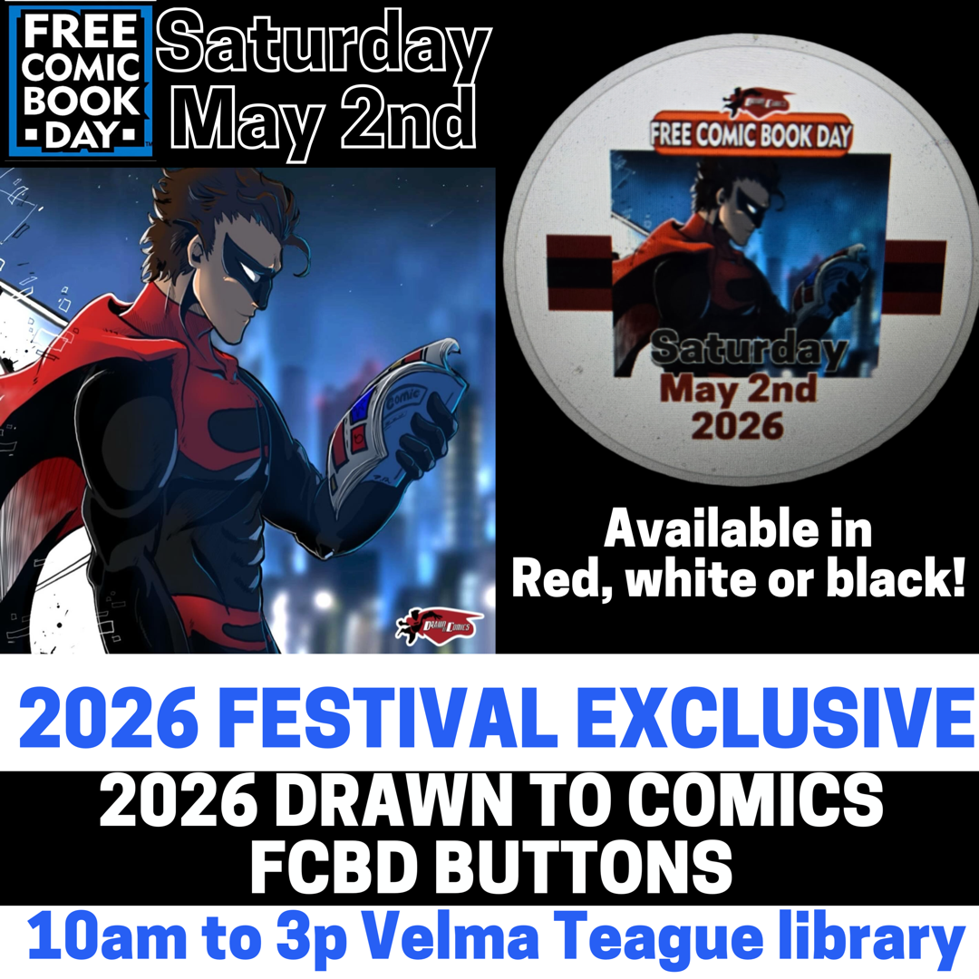 Free Exclusive Drawn To Comics Free Comic Book Day 20 button with art by Drawn To Comics’ Captain Customer BY guest artist Joselyn De La Torre produced by Ken’s Buttons! limited to 1000 available, while supplies last.