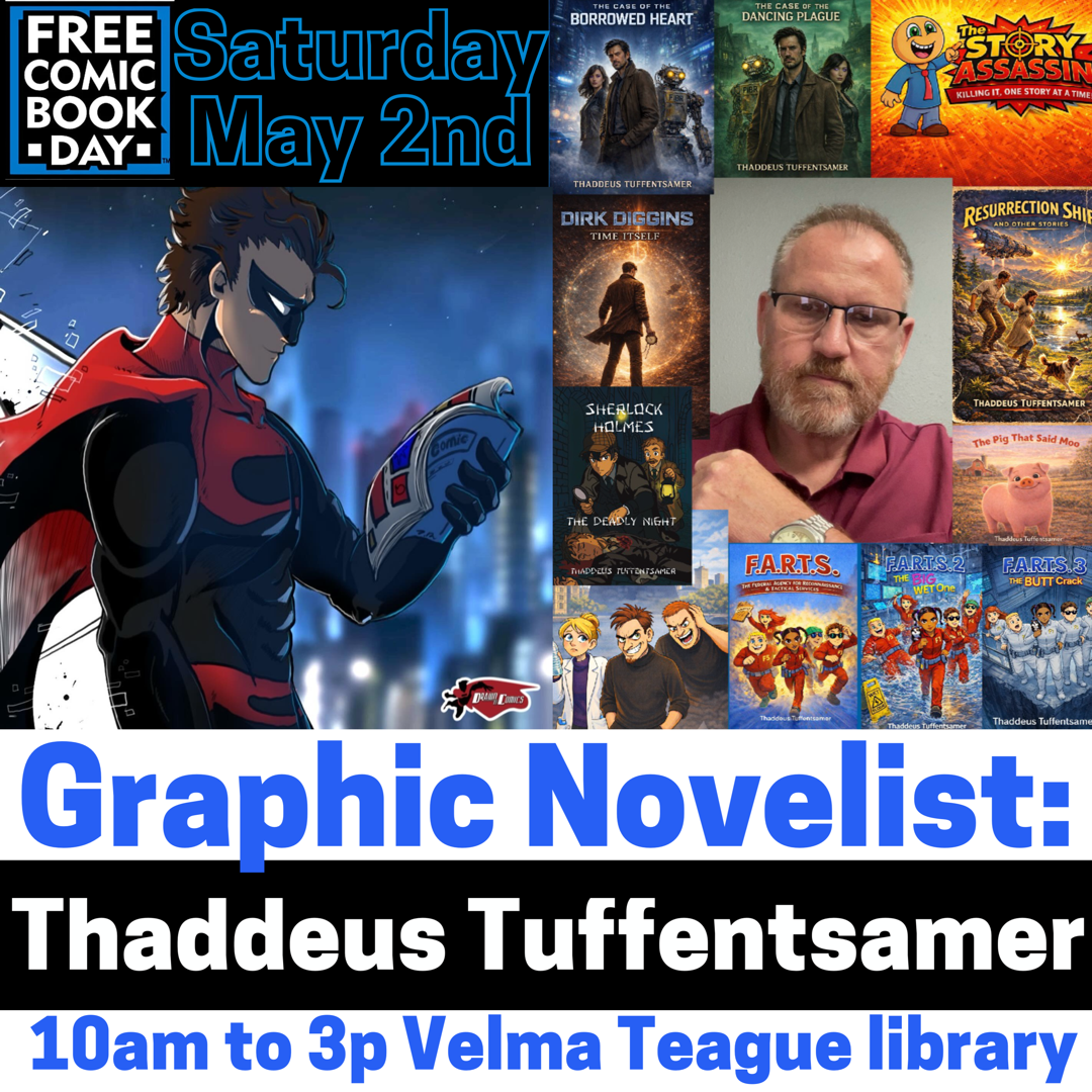 Thaddeus Tuffentsamer is a local author, living in Goodyear. He has written a variety of books, from children’s, middle-school, to Sherlock Holmes and his newest series, Dirk Diggins Private Eye, which is likened as, A 1930’s hard-boiled detective, infused with the genius of Sherlock Holmes, add a touch of Doctor Who and occasionally drop him into The Hitchhiker’s Guide to The Galaxy!