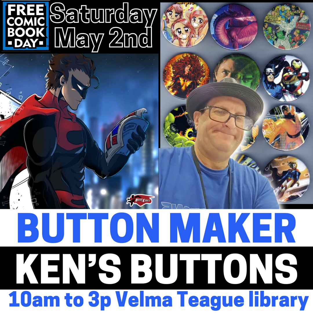 Kens Buttons returns this year as a vendor at the Drawn To Comics Free Comic Book Day Festival 20.